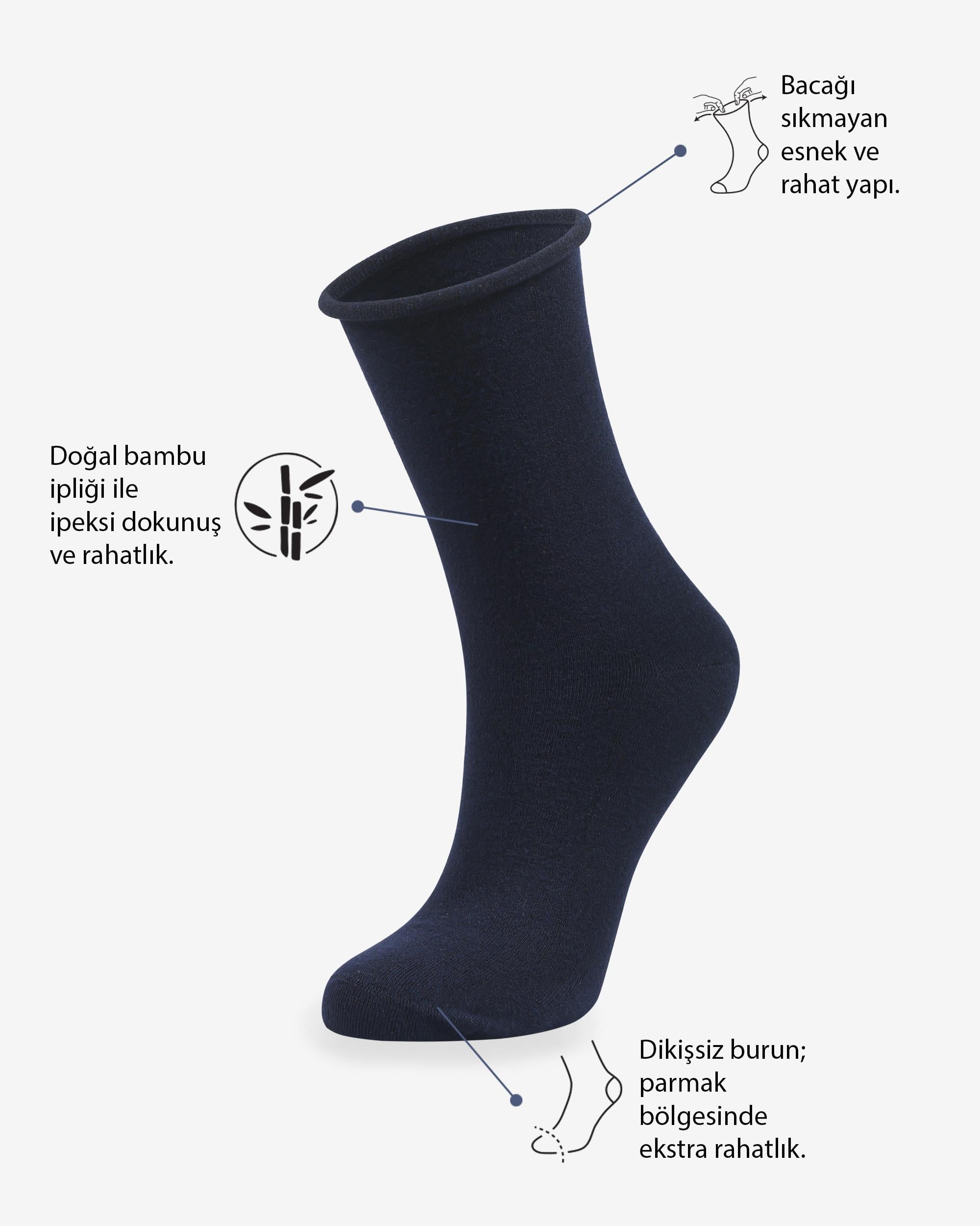 Konforlu bir çorabın iyi görünmesi de önemlidir. Kadın Roll Top Lastiksiz Bambu Çorap Lacivert, farklı kombinlerde rahatça kullanılabilecek bir parçadır.